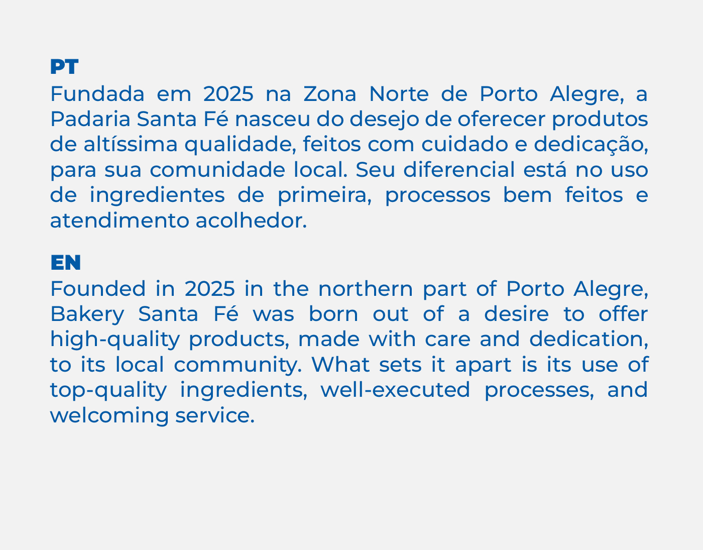 A Padaria Santa Fé nasceu na Zona Norte de Porto Alegre com o propósito de oferecer pães e produtos artesanais de alta qualidade, feitos com cuidado e sabor de verdade.